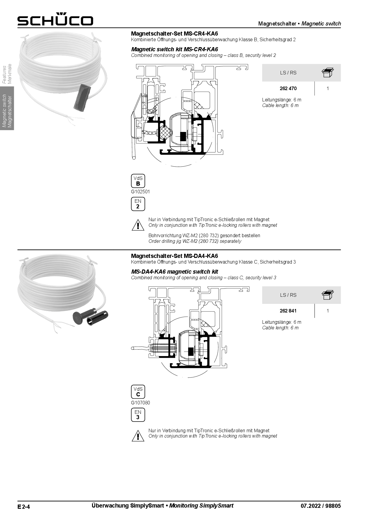Lieferumfang je Stück: ein Magnetschalter-Set, ohne ZubehörProduktmerkmale:für nach innen öffnende Fenster kombinierte Öffnungs- und Verschlussüberwachung Klasse B / Grad 2nur in Verbindung mit TipTronic e-Schließrollen mit Magnet ESR2, ESR4 oder ESR6Leitungslänge: 6 manschließbare GeräteSchüco SensormoduleSchüco Fensteraktorenhandelsübliche SteuerungenVdS EinbruchmeldeanlagenTechnische Datenmax. Schaltspannung: 100 V DCmax. Schaltstrom: 1 Amax. Dauerstrom: 1,5 Amax. Kontaktbelastung: 10 WSchutzart: IP 67Kontaktart: Schließer / NOUmweltklasse nach VdS 2110: III Anschlussleitung Leitungstyp: Li2Y2Y 4 x 0,14 mm², halogenfrei Leitungsdurchmesser: 3,2 mm (± 0,2 mm) Leitungsende: - Länge der Einzeladern Magnetschalter (LK) ca. 3 cm, Einzeladern ca. 8 mm abisoliert - Länge der Einzeladern Sabotageschleife ca. 1 cm, Einzeladern nicht abisoliert Farbe der Leitung: weiß Farbe der Einzeladern: weiß Gehäuse Farbe: RAL 9005 Abmessungen (L x B x H): 29 x 12 x 6 mm Material: Kunststoff verstellbar: nein Montageart: schraubenlos Umgebungsbedingungen Betriebstemperatur: - 25 °C bis + 70 °C Transport- und Lagertemperatur: - 25 °C bis + 70 °C Herstellerangaben:Firma: SchücoHerstellerartikel: 262470Vorgängerartikel: 262469 Hinweis: Wir empfehlen, das Austauschen von Beschlagteilen sowie das Justieren des Fensters/der Tür durch eine Fachkraft vornehmen zu lassen